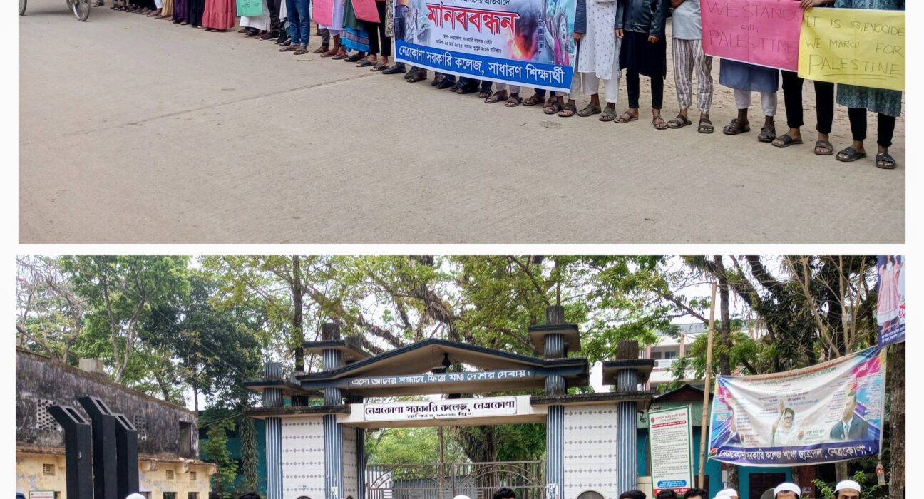 “ফিলিস্তিনের উপর ইসরাইলি হামলার প্রতিবাদে নেত্রকোণা সরকারি কলেজে মানববন্ধন”