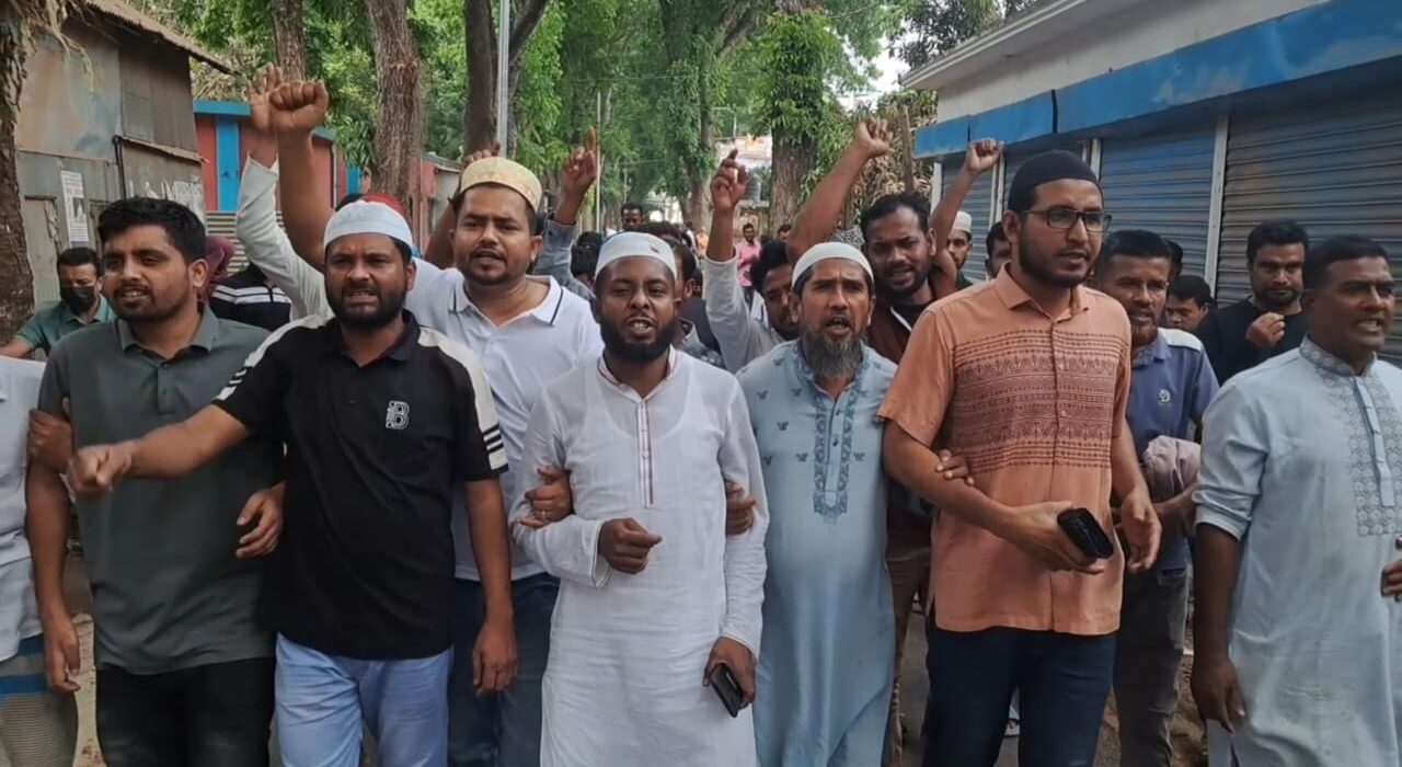 শরীয়তপুরে বাসের ধাক্কায় কাপড় ব্যবসায়ীর নিহতর ঘটনায় মানববন্ধন ও বিক্ষোভ