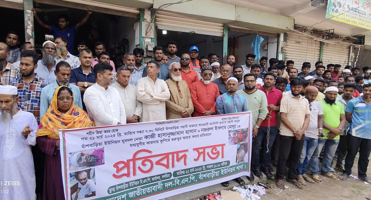 রোববার বেলা ১১টায় বাঁশবাড়িয়া ইউনিয়ন বিএনপির কার্যলয়ের সামনের সড়কে প্রায় তিন শতাধিক নারী-পুরুষের উপস্থিতিতে ঘন্টাব্যাপী এ প্রতিবাদ করেন উপজেলা ও ইউনিয়ন বিএনপি এবং তার সহযোগী সংগঠনের নেতা-কর্মীরা।
