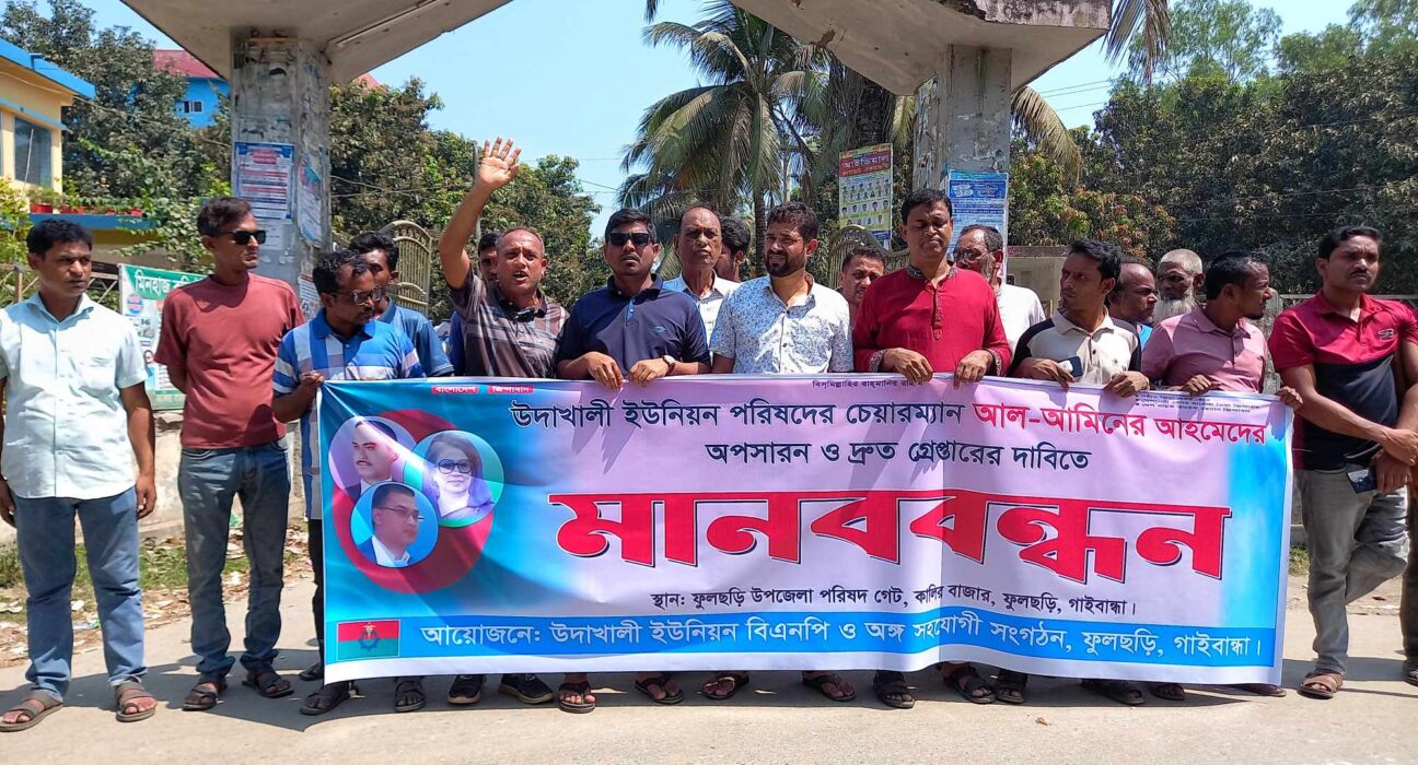 গাইবান্ধা জেলার ফুলছড়ি উপজেলার উদাখালী ইউনিয়ন পরিষদের চেয়ারম্যান আল আমিন আহমেদের অপসারণ ও গ্রেফতারের দাবিতে ২৫ মার্চ মঙ্গলবার মানববন্ধন করেছে বিএনপির নেতাকর্মীরা।