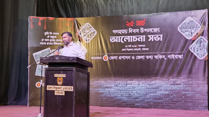 গাইবান্ধা জেলা শিল্পকলা একাডেমি মিলনায়তনে জেলা প্রশাসন ও জেলা তথ্য অফিসের আয়োজনে ২৫ মার্চ গণহত্যা দিবস ও মহান মুক্তিযুদ্ধ স্মরণে এক আলোচনা সভা অনুষ্ঠিত হয়েছে।