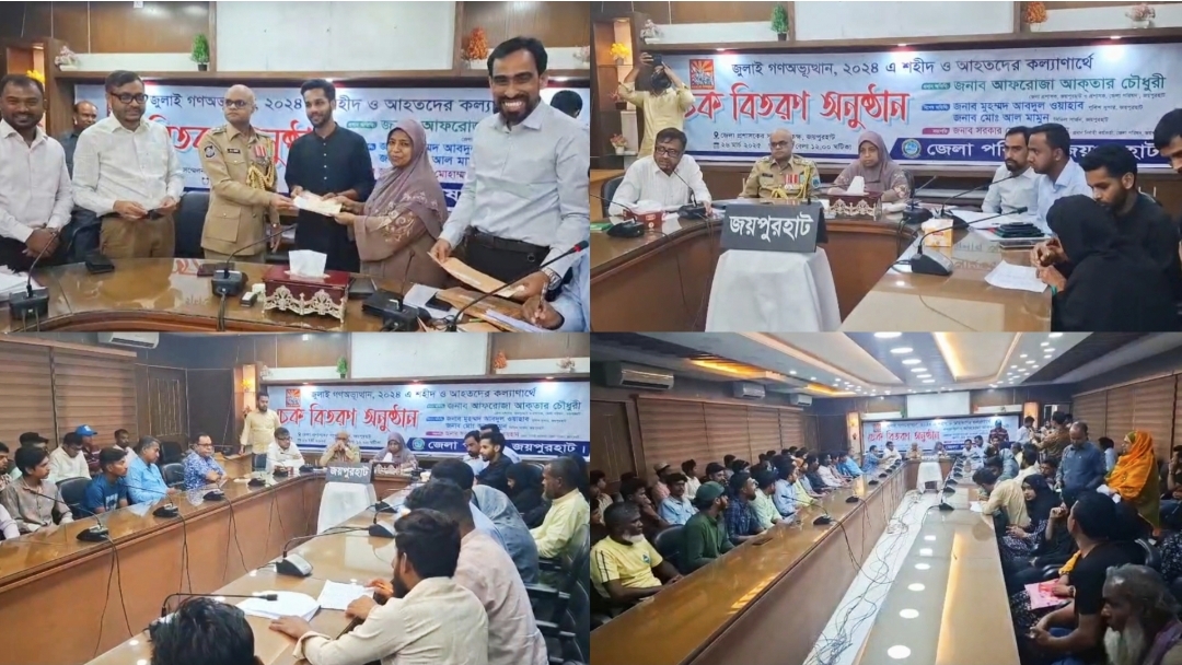 এসময় ছাত্র-জনতার অভ্যুত্থানে জয়পুরহাট জেলায় শহিদ ও আহত মোট ৯০টি পরিবারের হাতে আর্থিক সহায়তার চেক ও স্বাস্থ্য ও পরিবার কল্যাণ মন্ত্রণালয় কর্তৃক আহতদের জুলাই যোদ্ধা স্বাস্থ্য কার্ড ৭৭ টি বিতরণ করা হয়। নিহত ৪ জনের পরিবারকে ২ লাখ টাকা, আহত ৮৬ জনের মধ্যে এ ক্যাটাগরির ৪ জনের প্রত্যেককে ৩০ হাজার টাকা, বি ক্যাটাগরির ২ জনের প্রত্যেককে ২৫ হাজার টাকা ও সি ক্যাটাগরির ৮০ জনের প্রত্যেককে ২০ হাজার টাকাসহ সর্বমোট ৩৫ লাখ ৭০ হাজার টাকা ও পাঁচবিবির বাগজানা এলাকার আহত যোদ্ধা রতন চৌধুরীকে একটি ল্যাপটপ বিতরণ করা হয়।