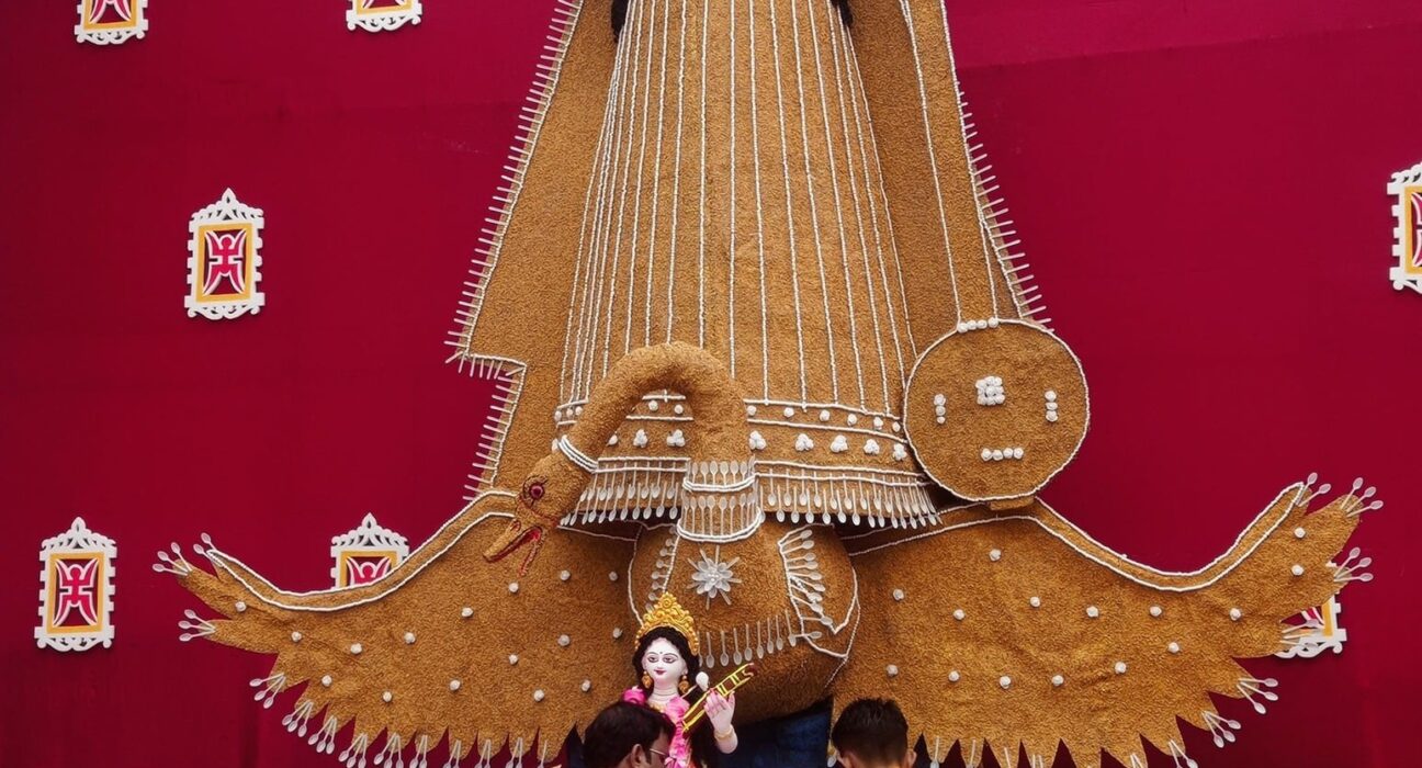 শ্রীমঙ্গল ধান দিয়ে তৈরী ২১ ফুট উচ্চতা প্রথম সরস্বতী প্রতিমা